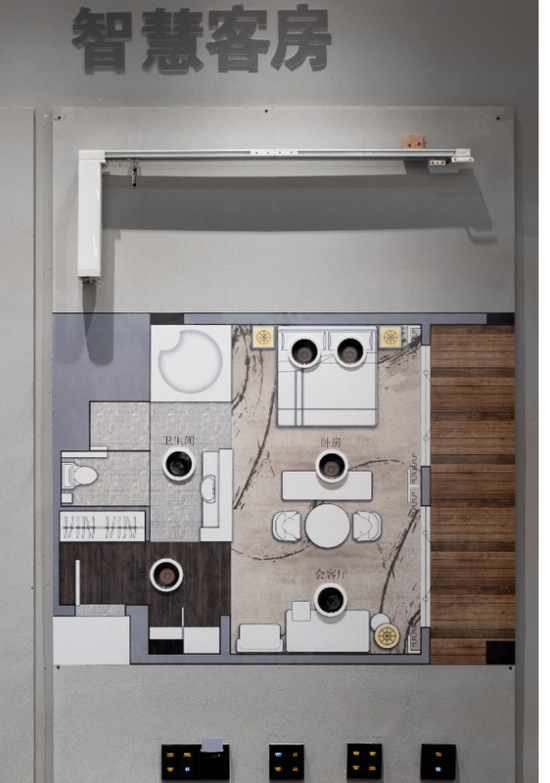 门口是一块门铃面板,上面显示房间的状态,房间里面也做了一些场景化的设置,包括温馨模式、休闲模式、全亮模式、起夜模式等等。