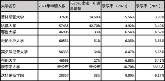 ●平均录取录:指录取率低于9%的23所大学,其录取率的平均值。虽然2021年美国大学录取率大幅下滑,但对于未公布录取率的大学,本统计仍采用2020年该大学的录取率进行汇总计算。