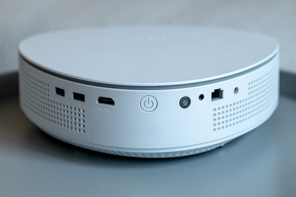 这款坚果G9投影仪的定位是一款家用投影仪,外观延续了之前坚果G7S的同款设计风格,在材质和做工上略有不同,采用了圆盘式的设计整体的感觉非常圆润,材质为玻璃面板周身采用环绕的织物包裹。