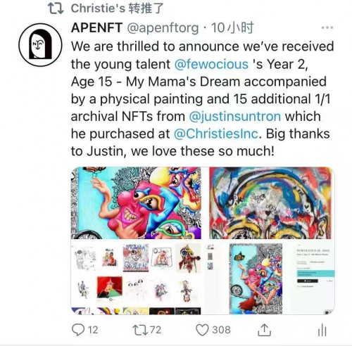 孙宇晨以近44万美元拍得Fewocious的NFT作品