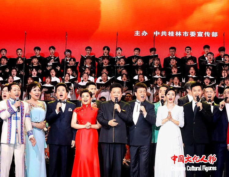 中国文化人物(主编 王保胜)5月15日晚,广西桂林体育馆座无虚席。为热烈庆祝中国共产党成立100周年,由中共桂林市委宣传部主办,桂林市文学艺术界联合会、中国东盟艺术学院等单位协办的“郁钧剑从艺五十周年回乡演唱会”在这里隆重举行。郁钧剑、吕继宏、刘和刚、张也、佟铁鑫、李丹阳、吕薇、王丽达、王庆爽、姜丽娜、陈永峰、吕宏伟、降央卓玛、谭学胜、穆维平、吴扎拉涛、王志昕、孙维良、贾双辉、毋攀、于海洋、曾勇、孔庆学、毛一涵等来自全国各地的70多位艺术家都参与到这场演唱会中,有的倾情献唱,有的助力幕后工作,他们用歌声讴歌伟大的党、伟大的祖国、伟大的人民。此次演出传递了拳拳的赤子之心,洋溢着浓浓的家乡情怀,不仅令现场4500多位家乡父老乡亲肃然起敬,场面感人,而且通过中国文化人物直播平台在线观看的人数也突破1800万。