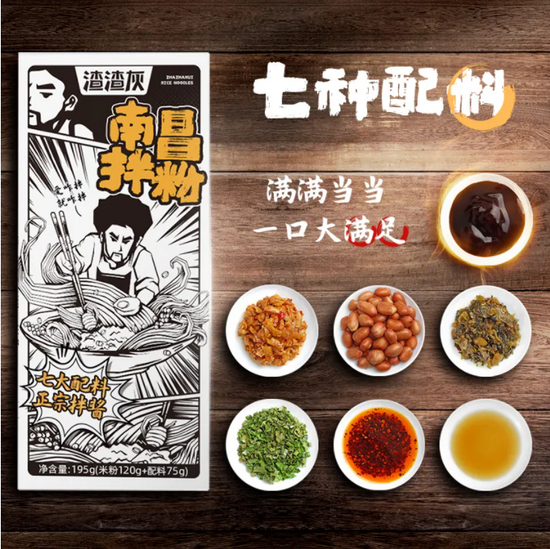 在成功推出南昌拌粉后,渣渣灰团队已陆续开发了6种口味的拌粉,包括葱油酸豆角拌粉、卤香麻酱拌粉,以及“无肉不欢”系列的干香肉臊拌粉、菌香牛肉拌粉、笋香杂酱拌粉,口味可谓一应俱全,在众多品牌中独树一帜。