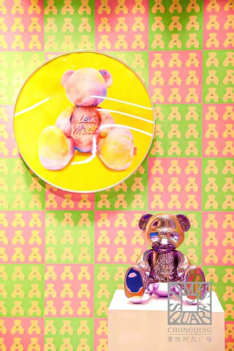 可力乐熊来自德国柏林。它虽然是一只天生患有情绪障碍症的孤独小熊,害怕与人交流,不知道该怎么表达自己,但它具有一颗顽强的内心,一直坚持着克服自身的性格缺陷去融入到这个世界,学会爱与被爱。所以从一开始冰冷的,几近透明的躯体,通过他们古老神秘的小熊家族特有的心灵传送来变换身体的颜色传递内心的情绪。这个夏天可力乐熊来到了重庆时代广场,他铆足了劲,想给重庆的朋友们带来一丝夏日清凉。《你好,可力乐熊》展览来由三个不同空间组成-可力乐熊游乐园,可力乐熊会客厅和小熊的派对。可力乐熊的游乐园大大的可力乐熊脑袋是游乐园的入口,欢迎重庆的小伙伴进入它的游乐园。沁凉的薄荷绿棋盘格搭配冰雪紫的雪糕墙瞬间进入柏林的冰凉夏日。一只巨大的太空芭比粉可力乐熊坐在游乐园正中,它虽然笨笨的正襟危坐,但看着大家在它的游乐园玩耍,内心是超级开心的。雨后的彩虹将相邻的两只可力乐熊相连,银色的小熊在不锈钢镜面折射下变得酷酷的。可力乐熊会客厅——玩累了的重庆小伙伴们欢迎来到小熊会客厅稍微休息哦,小熊沙发,小熊镜子,小熊墙纸和小熊橱窗都可以让玩累的小伙伴们休息片刻。小熊的派对屋——最后一个空间是小熊的派对屋,湖蓝色的空间就像进入到了柏林傍晚的夜色,在湖边和好朋友们放上自己喜欢的音乐一起放空自我吧。